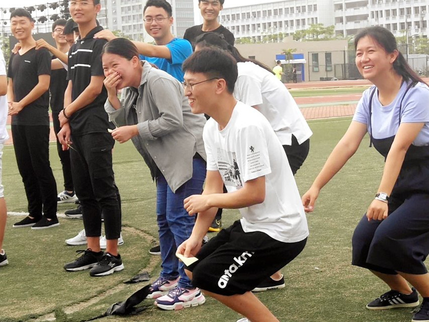 接下来便开始了正式游戏环节。首先是第一项团队合作的游戏--能量传输。各个小组都使出了浑身解数,在默契的配合之下,一个接一个地往前运输小球,即使在运送过程中甚至在终点前小球掉落下来,但还是能够及时从头开始,相互打气,最终完成挑战。