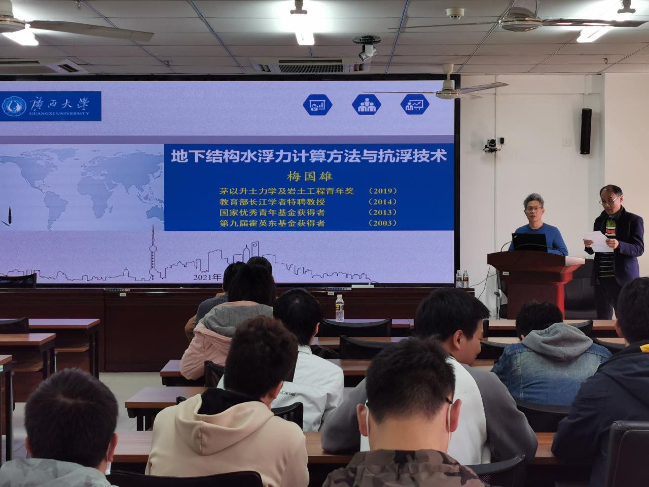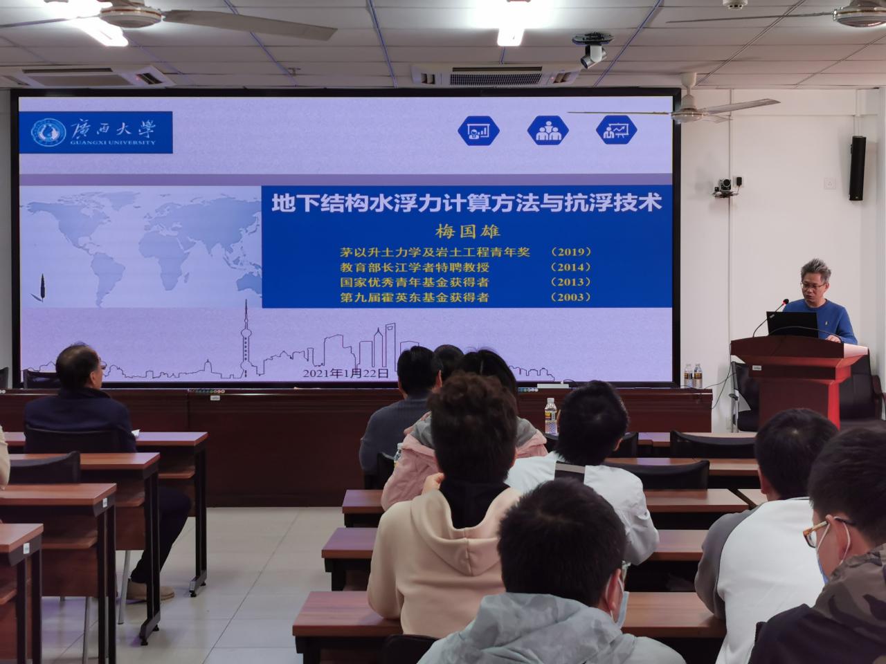 2021年1月22(周五)下午2:00-3:00点广西大学工程防灾与结构安全教育部重点实验室主任梅国雄应公司周智经理的邀请,在bsports必一登录入口研发楼510报告厅做《地下结构水浮力计算与抗浮关键技术》学术报告。报告会由张友良副经理主持,我院教师和研究生近30人参加了此次学术报告会。